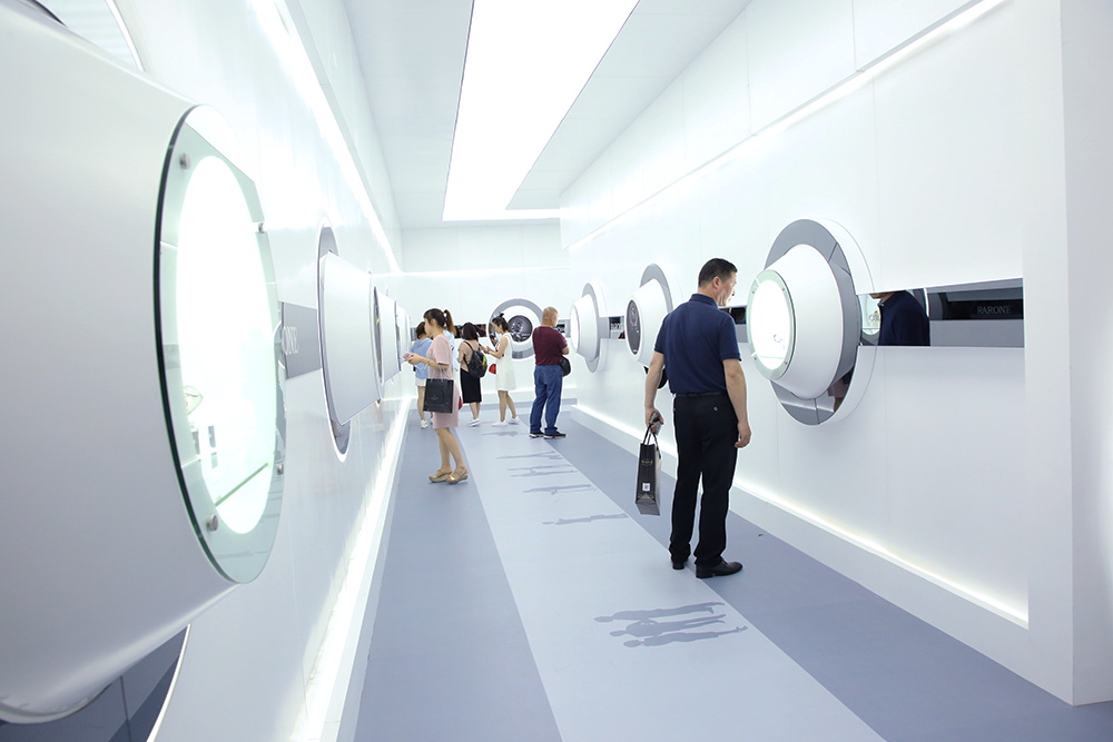 Rarone Pavilion is composed of an abstract circular dial with a wavy band this year, which has great visual impact with the light. White lines like piano keys around the booth wall, which is smooth and graceful and perfectly melted time and elegant life. A time tunnel set up at the entrance to allow light shadow back and forth, it is to lead a new business experience and trend. The water curtain wall of the booth symbolizes the perfect integration of the flow of time, and can reach more vivid show effect.