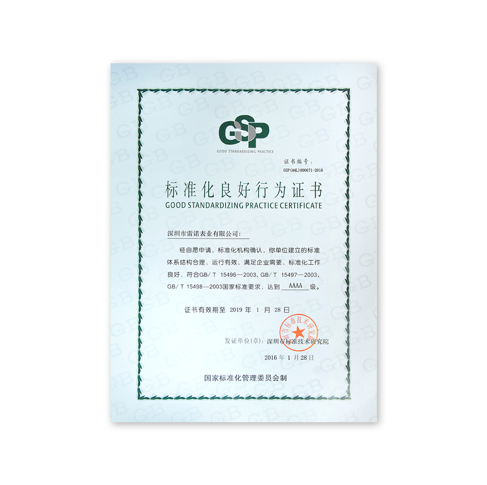 雷諾表早在2011年導(dǎo)入企業(yè)標(biāo)準(zhǔn)化體系,并于2012年被確認(rèn)為“AAAA級標(biāo)準(zhǔn)化良好行為企業(yè)”,時至今日,雷諾表標(biāo)準(zhǔn)化體系已健康運作三年;2016年1月27日,專家組通過審查標(biāo)準(zhǔn)體系資料及運行記錄、查看生產(chǎn)現(xiàn)場和技術(shù)中心實驗室,對雷諾表標(biāo)準(zhǔn)化工作給予了高度評價。